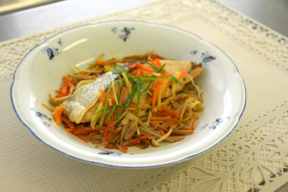 - 耐熱皿にえのきを広げて入れ、その上に鮭をのせて人参、長ネギ、しょうがを上にのせる。〈A〉をかけ、ふんわりとラップをしたら電子レンジ(600w)で4~5分加熱する。皿に盛り付けたら完成